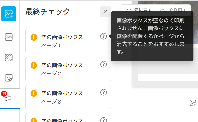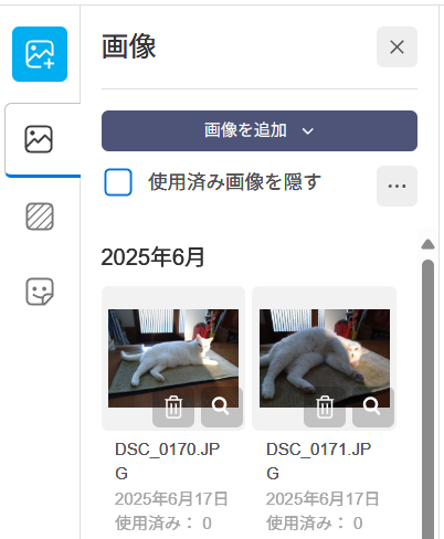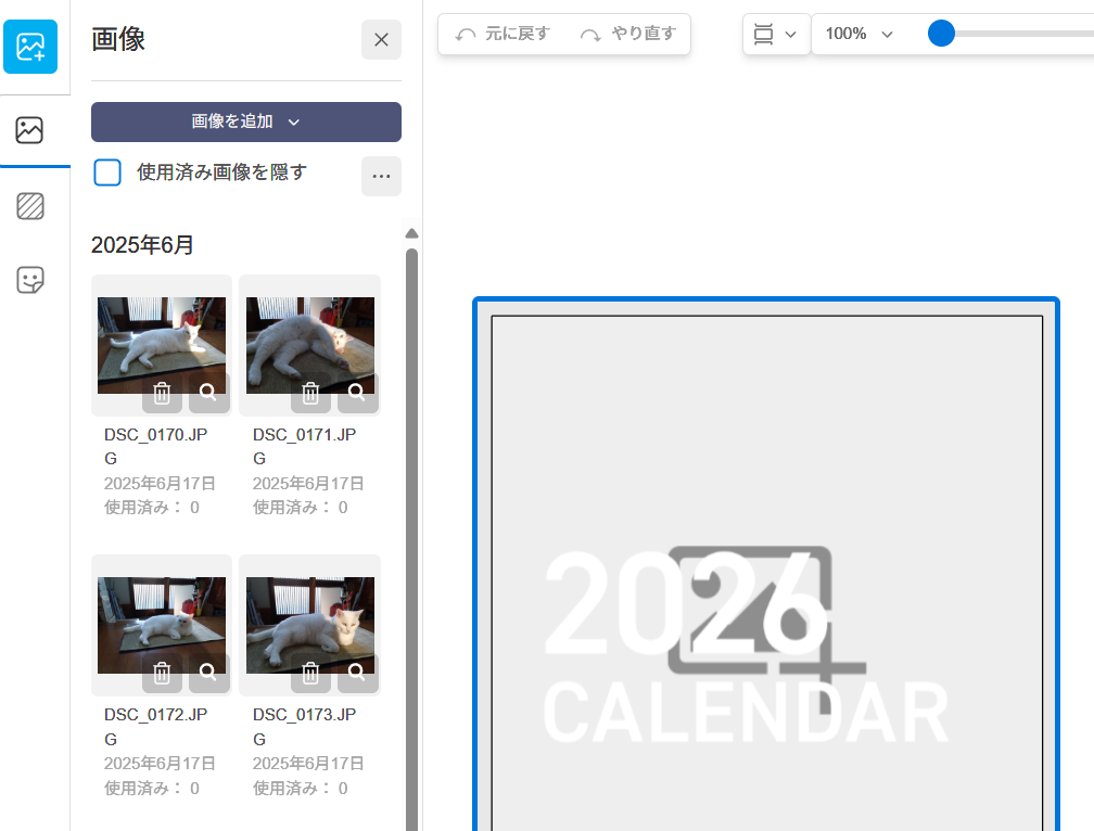 ※使用済み画像を隠すにチェックを入れると、配置した写真が表示されなくなり、写真を重複して使用することを防げます。