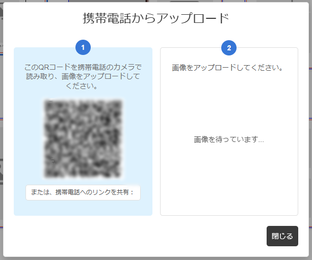 携帯電話からアップロード...:QRコードが表示され、スマートフォンのカメラでQRコードを読み込むと、スマートフォン上の写真をアップロードできます。