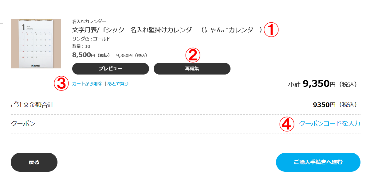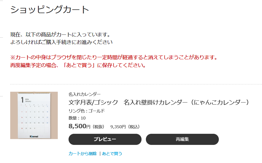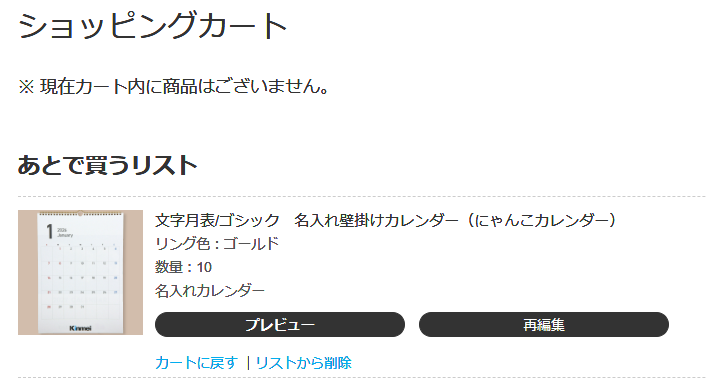 あとで買う:カートから出します。制作データは保持されているので、再編集することができます。