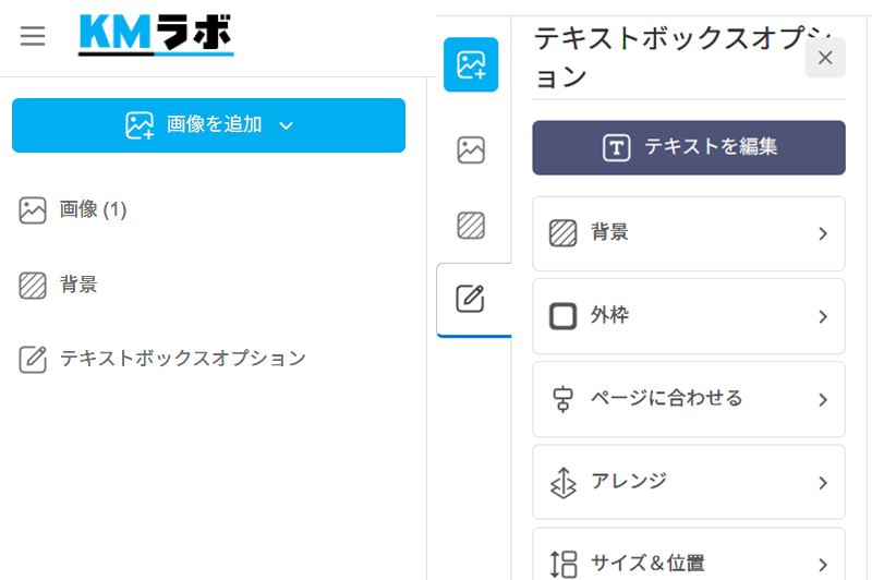 画面ではテキストボックスを選択した場合のサイドメニューが表示されていて、テキストボックスへの編集機能が表示されています。
